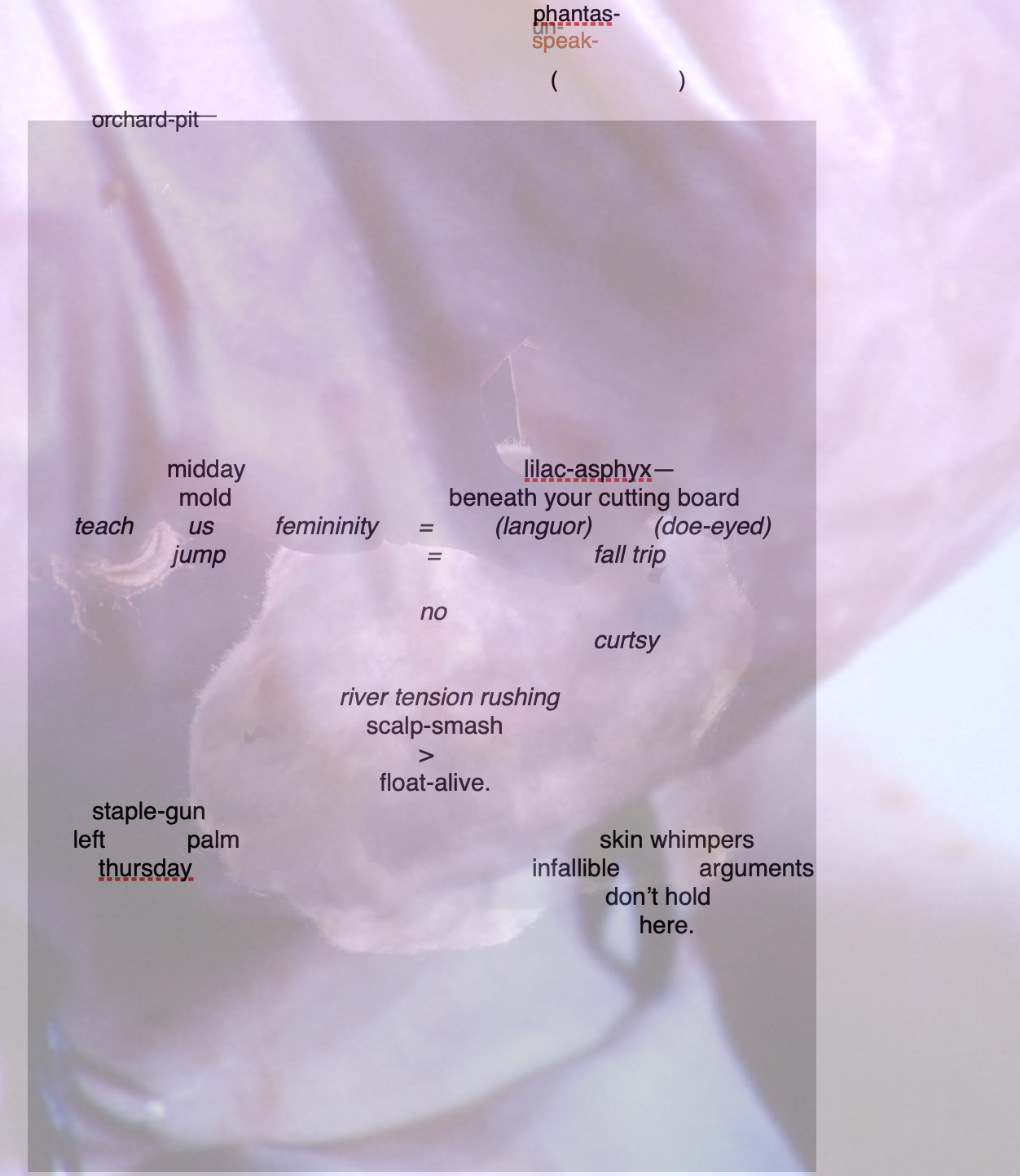 Burnt rye & bacon & I am six again. Waking up in the butterfly room. Are you my mother? She pretends she’s unable to walk & has night terrors & falls from the bed. She brushes up against the door & her skin tears & she pauses to pinch back the blood & bruises & her peony white hair. Mother, mother, oh mother. Yes? You lay down with her in the bed until her breathing slows. You sneak out of bed to watch TV its only 9pm. She doesn’t see you & stands up & walks to the TV & turns it off. You’ve been able to walk this entire time? She falls down. Her catheter comes out & you have to change it. She embarrassed. She swats at your hand. You wait until she falls asleep.